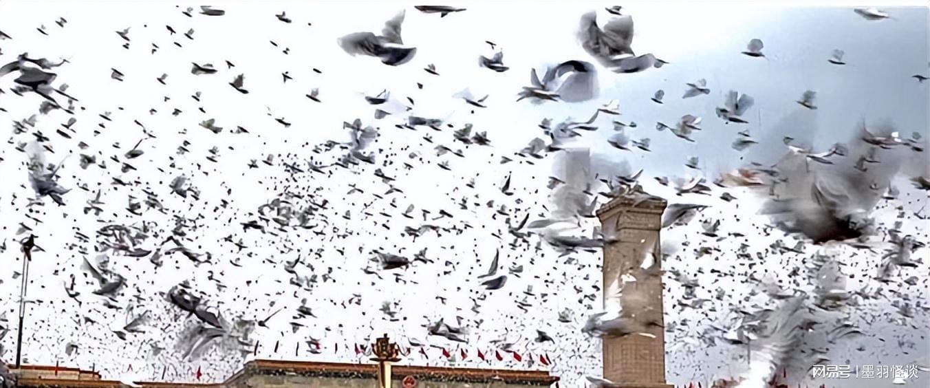 9月3号那天,当信号旗一落,十二辆放飞车的门同时打开,八万只鸽子扑棱着翅膀一下子飞上天,密密麻麻的鸽群在广场上空转了几圈,再跟着气球一起往远处飞,全场人都忍不住拍手叫好。