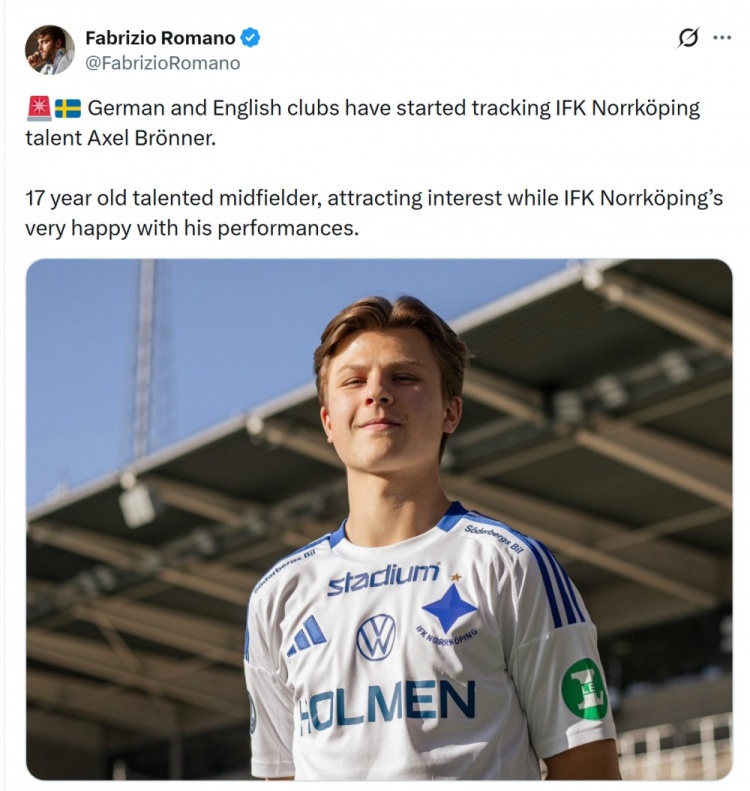 罗马诺透露,北雪平小将布伦纳吸引了多家俱乐部的兴趣,德国和英格兰俱乐部开始关注球员的情况。